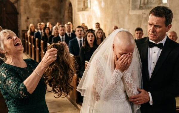 During the wedding, my mother-in-law came up to me and ripped off my wig, exposing my bald head to all the guests. Gasps echoed through the church, and my cheeks burned with humiliation—until the unexpected happened.