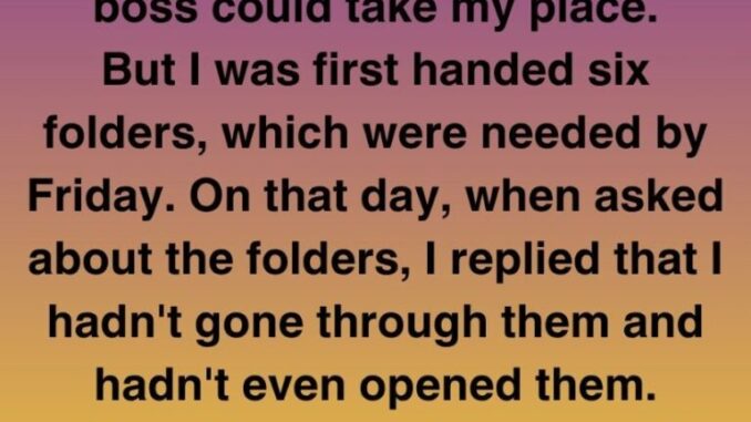 I was laid off so a friend of my boss could take my position. On my last week, he handed me six thick folders that were due by Friday. When Friday came, I told him I hadn’t even opened them. The look on his face was priceless.