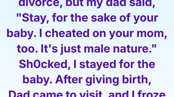 He sighed deeply. “I never cheated on your mom. I said that because I didn’t want you dealing with all that stress while you were pregnant. I just wanted you and the baby to be safe. Now that you’re both okay, we can handle your husband the right way.”
