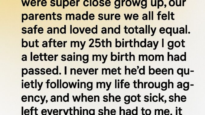 After my twenty-fifth birthday, I received a letter that gently reopened a part of my life I had never explored. It revealed that my birth mother had passed away. Though I had never met her, I learned she had quietly followed my life, checking on me from afar. In her final days, she left everything she had to me—not just material things, but proof that she had cared deeply. I attended her funeral alone, surrounded by strangers, feeling gratitude and curiosity toward a woman I’d never known but who had thought of me all those years.