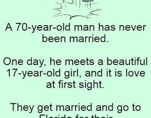 A 70-year-old man had never been married. One day, he meets a young woman, and they fall in love at first sight. They get married and go to Florida for their honeymoon.