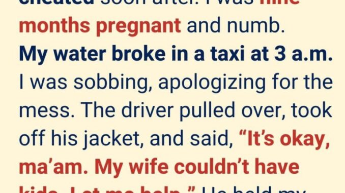 The night my water broke, it was around 3 a.m., and I was alone in the apartment. I called a taxi, knowing I couldn’t trust myself to drive. By the time I got into the back seat, the contractions were already hitting hard. Then suddenly, my water broke, soaking everything. I panicked, crying and apologizing over and over, completely embarrassed.
