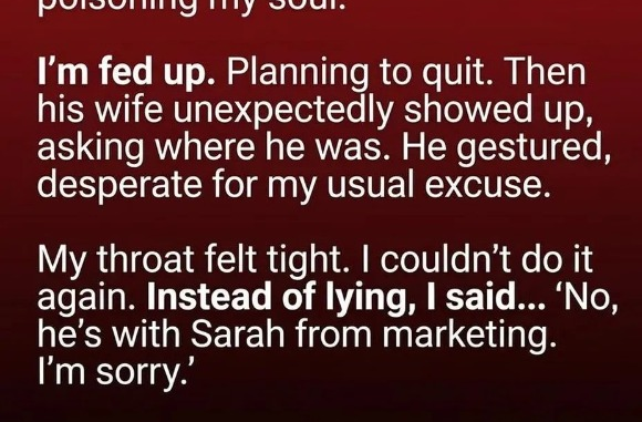 By the time I began writing my resignation letter, I had already made up my mind. I needed out—a clean break, a chance to breathe again without being tied to someone else’s secrets. That morning, I practiced what I’d say, hoping to leave with some sense of dignity. But things didn’t go as planned. Just before lunch, the office door opened, and she walked in—his wife. Calm, steady, and clearly looking for answers. The atmosphere shifted instantly, and all the quiet lies I’d been holding onto felt like they were pressing in at once.