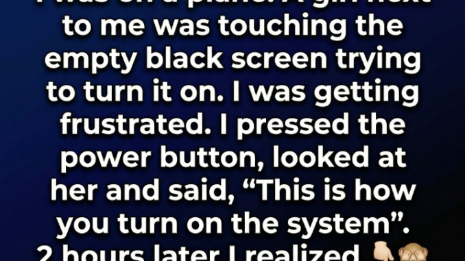 The cabin lights dimmed, and the low, steady hum of the plane created a calm, almost dreamlike atmosphere. I had just gotten comfortable in my seat, looking forward to a quiet flight, when I noticed the girl next to me repeatedly tapping the blank screen in front of her. She kept pressing it, her eyebrows slightly drawn together in focus. At first, I tried to ignore it, but after a few minutes, the constant tapping started to irritate me. Eventually, unable to hold back a sigh, I leaned over, pressed the power button, and said—more sharply than I meant to—“That’s how you turn it on.”