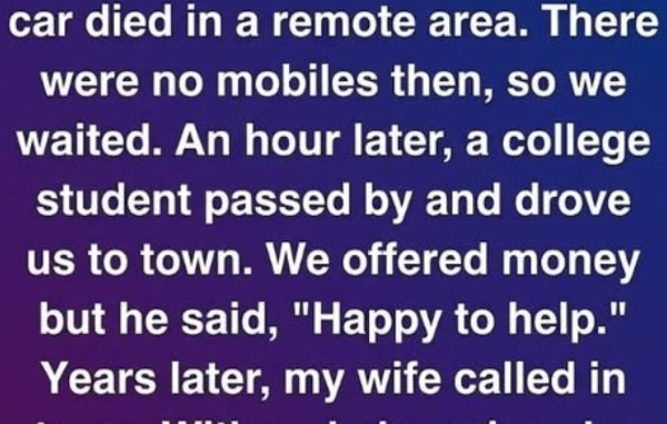 Eventually, a pair of headlights appeared in the distance. An old Toyota Corolla pulled over, and a young man stepped out. Without hesitation, he offered his help. He refused any payment, simply saying he was glad to assist.
