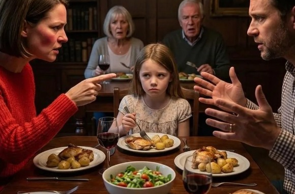 Dinner at my in-laws was supposed to be a normal evening—until my sister-in-law, Claire, suddenly stood up mid-meal, accused me of cheating on my husband, and then turned to our seven-year-old daughter, Sophie, claiming Robert wasn’t her real father. The room went silent. I was completely stunned, but my husband stayed eerily composed. He calmly sent Sophie out of the room, stood up, and turned on the dining room TV. Footage played showing Claire and his mother earlier that day, openly planning the entire setup—how she would make a public accusation, present a falsified paternity report, and stir enough chaos to derail an upcoming family trust meeting. Robert then produced a court-certified DNA document confirming he was Sophie’s father without question. The tension in the room turned suffocating. Then he informed everyone that his lawyer was already on the way.