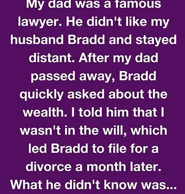 A week after the funeral, the lawyer contacted Sarah and revealed a hidden clause in her father’s will. He had arranged that if Bradd stayed married to Sarah for five years after his death, he would inherit half of everything. However, if they divorced before that period ended, Sarah would receive the full inheritance.