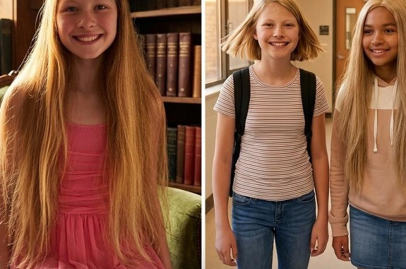 The night before had already been emotionally charged. I had found Letty in the bathroom, her hair unevenly cut, with a ribbon tied around the pieces she had removed. Tearfully, she explained that a classmate, Millie, had been struggling after an illness and had faced hurtful remarks from other children about her appearance. Letty had quietly chosen to cut and donate her hair in hopes it could be turned into a wig. It wasn’t a perfect fix, but it came from genuine compassion. I held her tightly, moved by her kindness. The next morning, with help from a salon, her haircut was corrected and shaped into something more even, and together we prepared a wig for Millie, uncertain how it would be received.