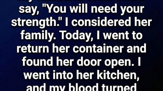 Mrs. Alden, who lived in the small gray cottage across the yard, was someone I only knew in passing. She had always been a quiet, steady presence in the neighborhood. That day, she stood on my porch holding a steaming pot of soup. She didn’t ask questions or offer sympathy. Instead, she simply said, You will need your strength today.