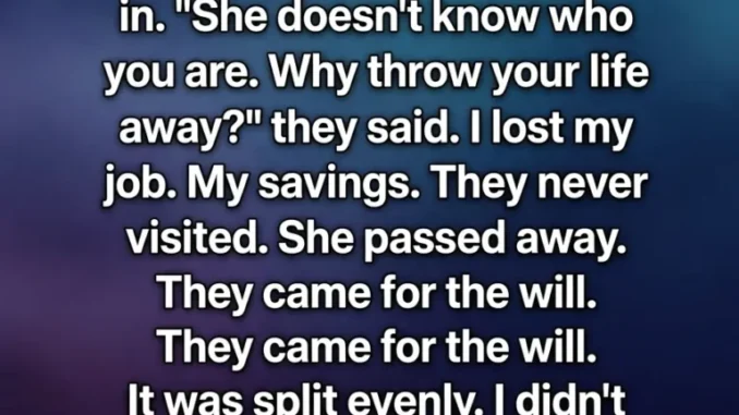 When the will was read, everything was divided evenly. I didn’t argue or bring up the years of care, the effort, or the love I had given in their absence. I simply accepted it. What mattered most to me couldn’t be measured in possessions or paperwork. I had been there for her when she needed someone, and that was enough.
