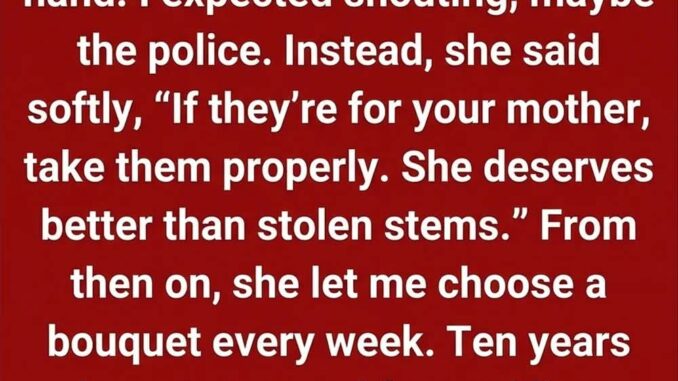 One day, the shop owner stopped me just as I was about to leave with another small bundle of flowers. I froze, expecting anger or a harsh scolding. Instead, the woman looked at me kindly and asked who the flowers were for. When I softly explained that they were for my mother’s grave, her expression grew gentle. She bent down so we were face to face and said words I would never forget: “If the flowers are for your mother, take them the right way. She deserves more than stolen ones.” From then on, she told me I could come into the shop every week and pick a small bouquet. Sometimes she even added an extra flower, saying it made the arrangement brighter. I never fully understood why she showed me such kindness, but those visits became a small source of comfort during one of the darkest times in my life.