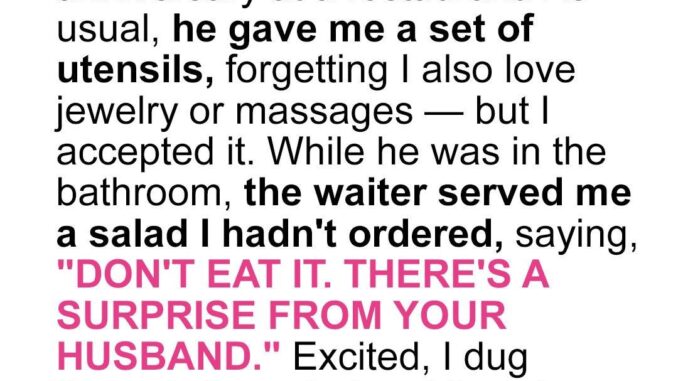 I hid my disappointment behind a polite smile, reminding myself that he was practical rather than romantic. When James stepped away from the table, I sat alone, questioning why I still expected more after all these years. Soon after, a waiter arrived with a salad I hadn’t ordered.