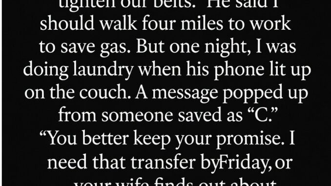Soon, his phone kept lighting up with messages from someone saved as “C.” One message froze me: “Send the transfer by Friday, or your wife finds out everything.”