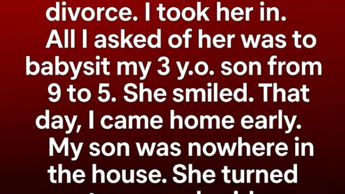 When my best friend called me after her divorce, her voice carried a weariness I’d never heard before. She wasn’t asking for much—just a place to stay until she could get back on her feet. Of course, I said yes. We had grown up together, shared countless secrets, and been there for each other through every stage of life. Offering her a spare room felt completely natural. The only favor I asked in return was simple: help me watch my three-year-old son during the day while I worked. She agreed with a gentle smile, and for a moment, everything seemed like it might fall perfectly into place.