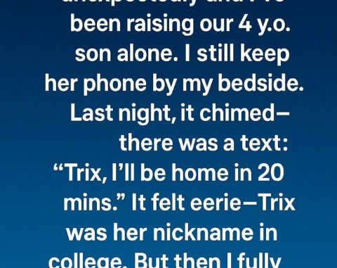 Some nights, I’d reach for her side of the bed, forgetting she wasn’t there anymore. I kept her phone on the nightstand, a tiny connection to her I couldn’t let go. Months passed without a ping—until last night, a soft chime broke the silence. The message read, “Trix, I’ll be home in 20 mins.” My breath caught.